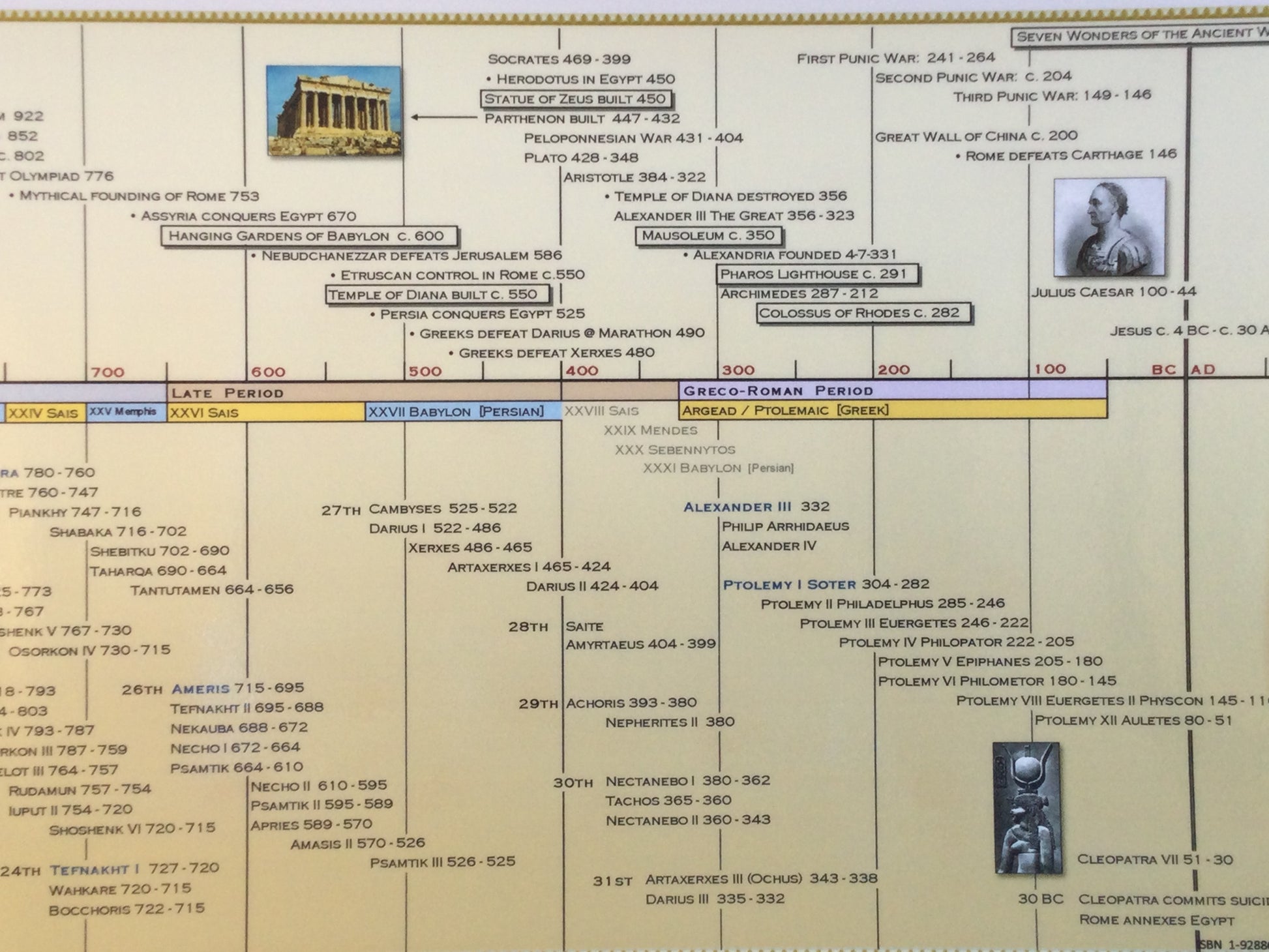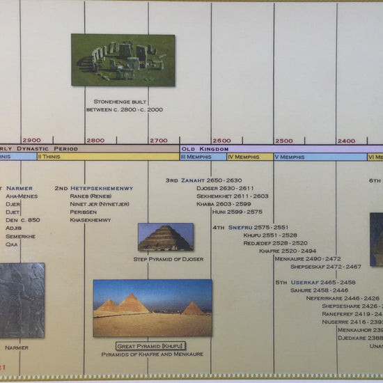 Explore the grandeur of Ancient Egypt with our meticulously detailed timeline poster. Spanning from the Early Dynastic period to the Greco-Roman period, this poster provides a comprehensive visual account of the key events, significant figures, and cultural achievements that defined one of history's most fascinating civilizations. Measuring 44 inches wide by 9.5 inches tall and laminated for durability, this poster is an essential educational resource and a captivating addition for history enthusiasts.