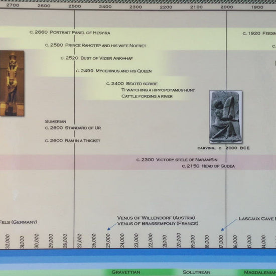 Discover the rich and diverse world of ancient art with our History of Ancient Art Timeline Poster. Spanning from 3000 BC to 1400 AD, this poster provides a comprehensive visual journey through the artistic achievements of civilizations such as the Egyptians, Mesopotamians, Minoans, Mycenaeans, Assyrians, Greeks, Etruscans, Persians, Romans, Byzantines, Islamic cultures, Ottonians, and the Romanesque and Gothic periods. Measuring 44 inches long by 9.5 inches tall, this poster is laminated for durability, making it an ideal resource for educational environments and art enthusiasts.