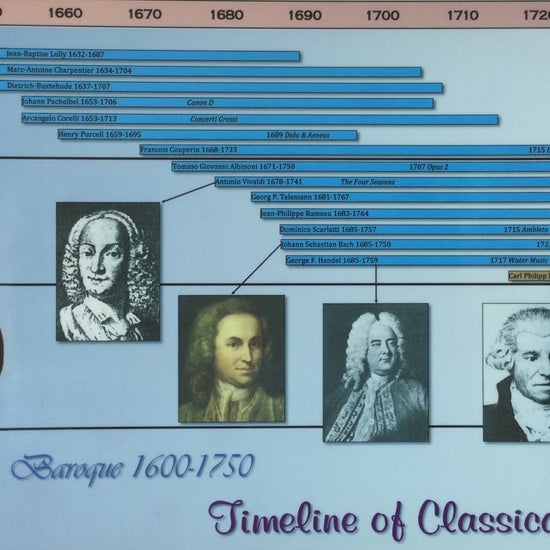 Explore the magnificent history of classical music with this durable and beautifully designed timeline poster, offering a comprehensive view of the composers and their timeless contributions to the world of music.