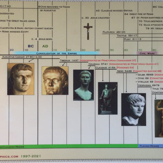 Immerse yourself in the grandeur and complexity of the Roman Empire with our meticulously detailed timeline poster. Featuring every Roman emperor from Augustus to the fall of the Western Roman Empire, this poster provides a comprehensive visual account of the key events, significant figures, and cultural achievements that defined this monumental era in history. Measuring 44 inches wide by 9.5 inches tall and laminated for durability, this poster is an essential educational resource and a captivating addition for history enthusiasts.