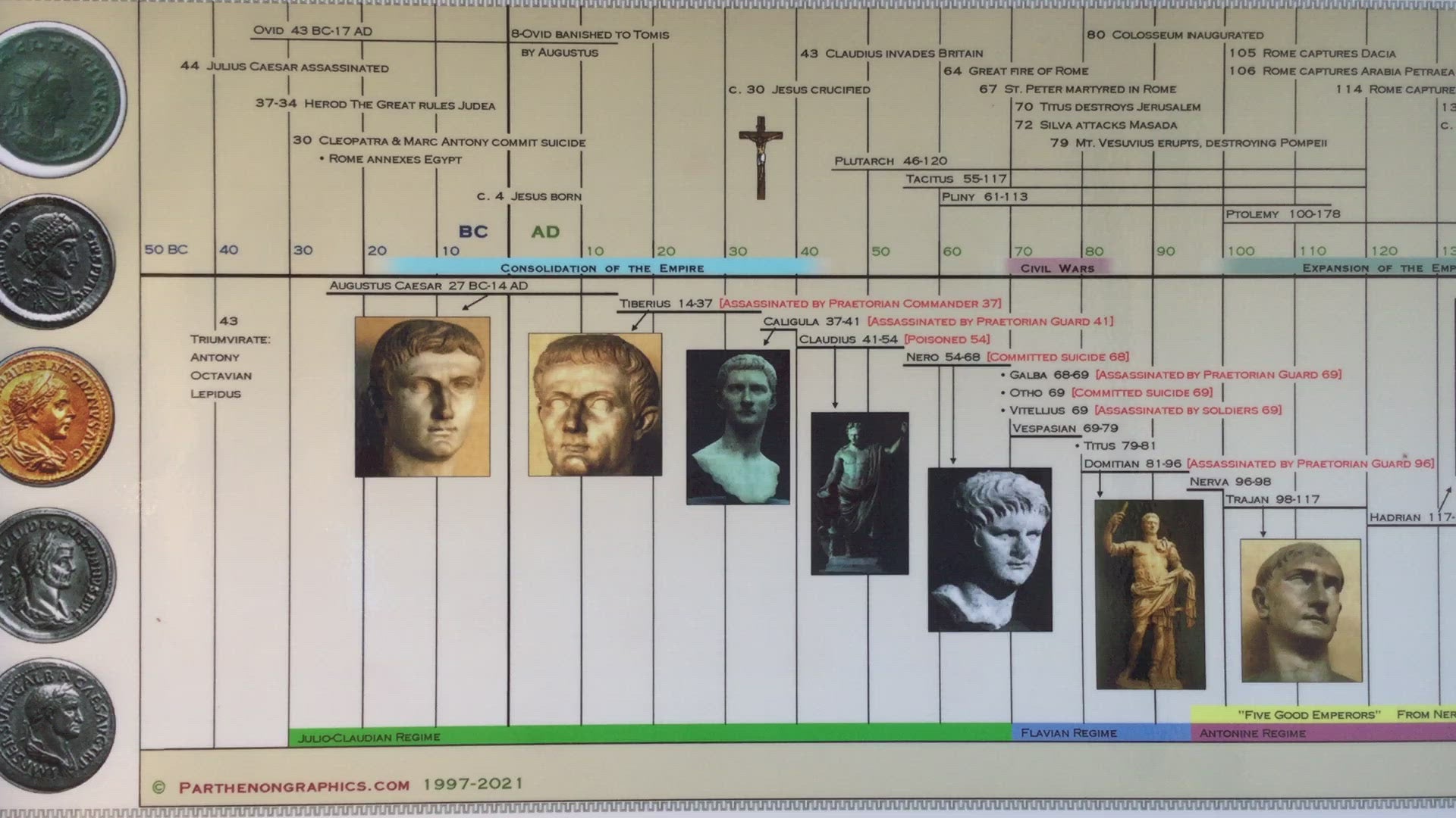 - Foundation and Early Empire (27 BC - 96 AD): The establishment of the Roman Empire by Augustus, significant early emperors, and the expansion of Roman territories.