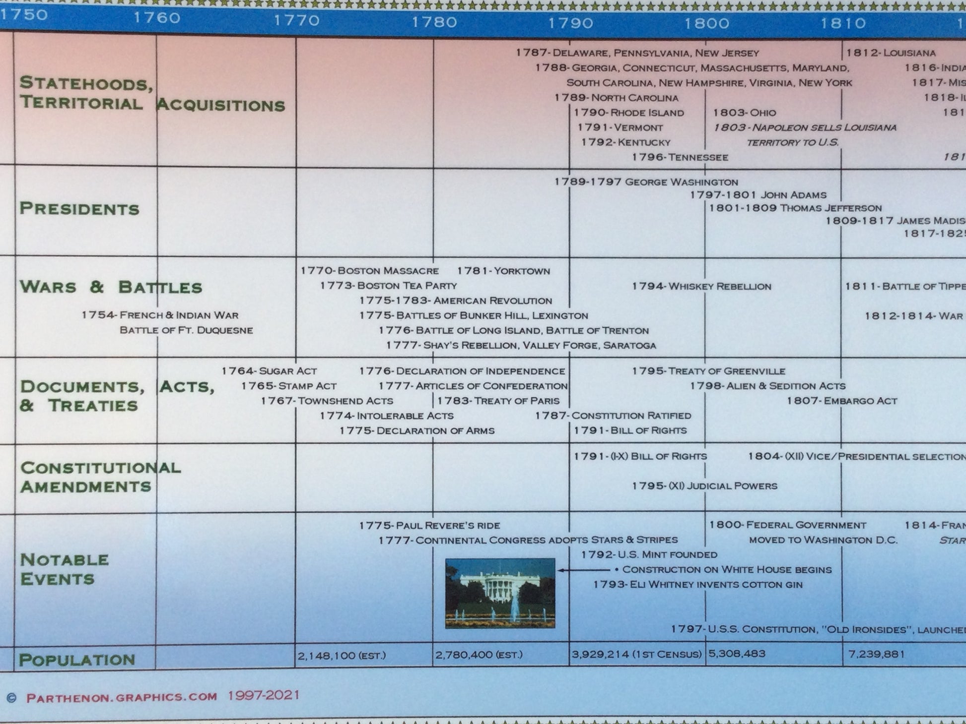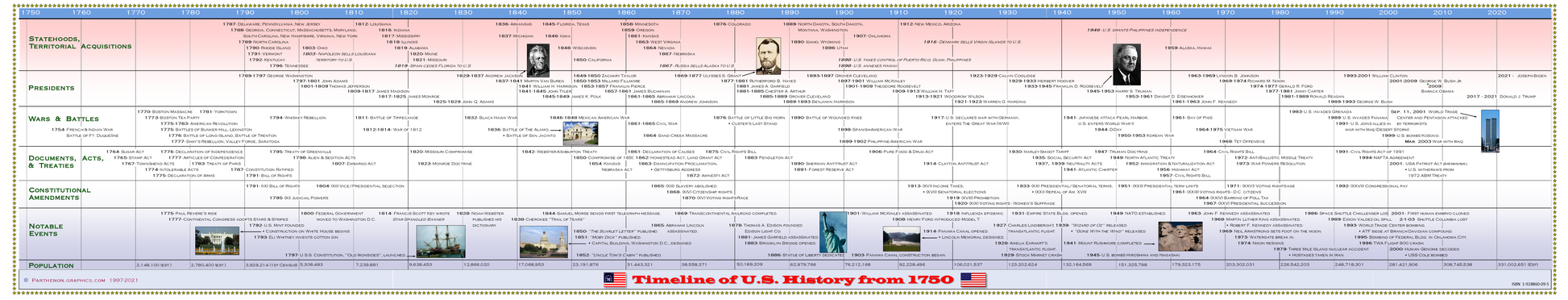 Explore the rich and dynamic history of the United States from 1750 to the present with our detailed timeline poster. Featuring key sections on Statehoods & Territorial Acquisitions, Battles & Wars, Documents, Acts & Treaties, Presidents, Population, and Notable Events, this poster provides a comprehensive visual account of the pivotal moments and developments that have shaped the nation. Measuring 44 inches wide by 9.5 inches tall and laminated for durability, this poster is an essential educational resource and a captivating addition for history enthusiasts.